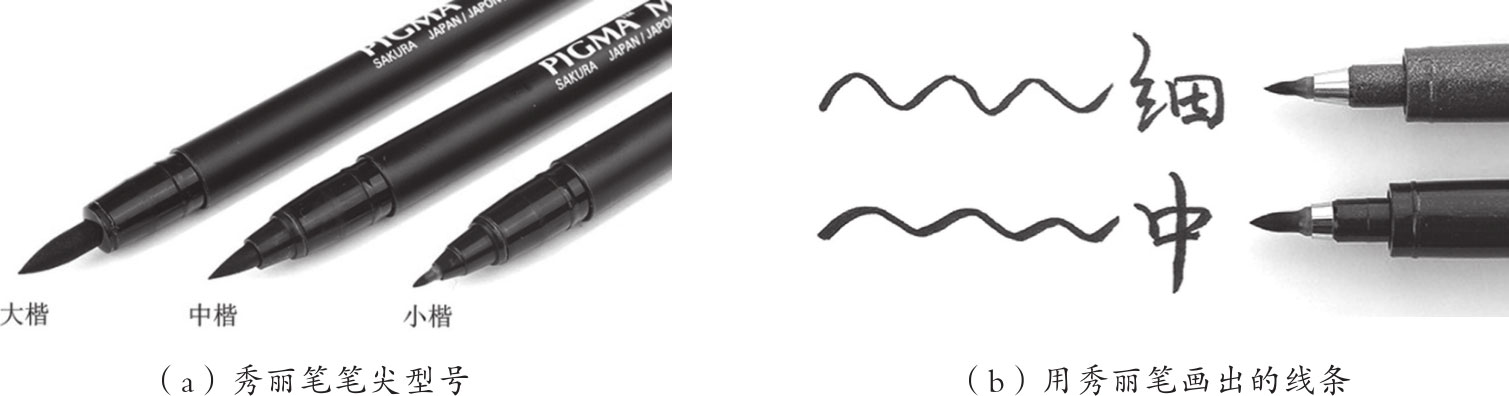 (2)秀丽笔。代表品牌有斑马牌,其最大的特点是笔尖为软尼龙头、墨水防水。秀丽笔的手感与毛笔类似。其绘出的线条柔美但不易控制,粗细变化非常大,因此作画速度受限。笔尖有大楷、中楷、小楷可选,如图1-9所示。