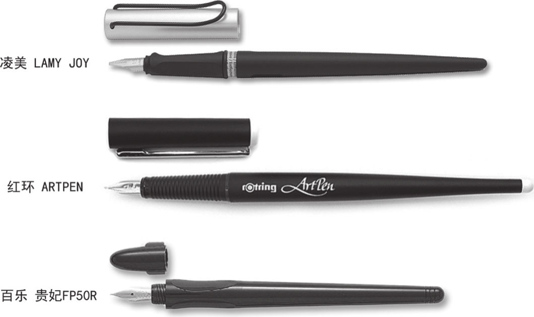 在造型上,有一种钢笔笔杆很长,尾部变细,如凌美的LAMY JOY、红环的ARTPEN、百乐的贵妃FP50R,如图1-14所示。这种造型形成的原因是绘画时握笔靠后、手腕转动幅度增大,因此增长笔杆便于使用者上下调节握笔位置,且逐渐变细的尾部使得绘画时能拥有最佳平衡感。