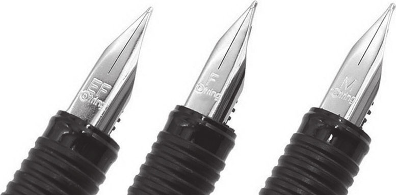 现代的钢笔笔尖粗细有型号可以选择,如ef、f、m等,粗细程度从细到粗,如图1-13所示。但这种对于粗细的划分只能在同品牌中进行比较,也就是说不同品牌的同型号钢笔的笔尖粗细可能相差甚远。