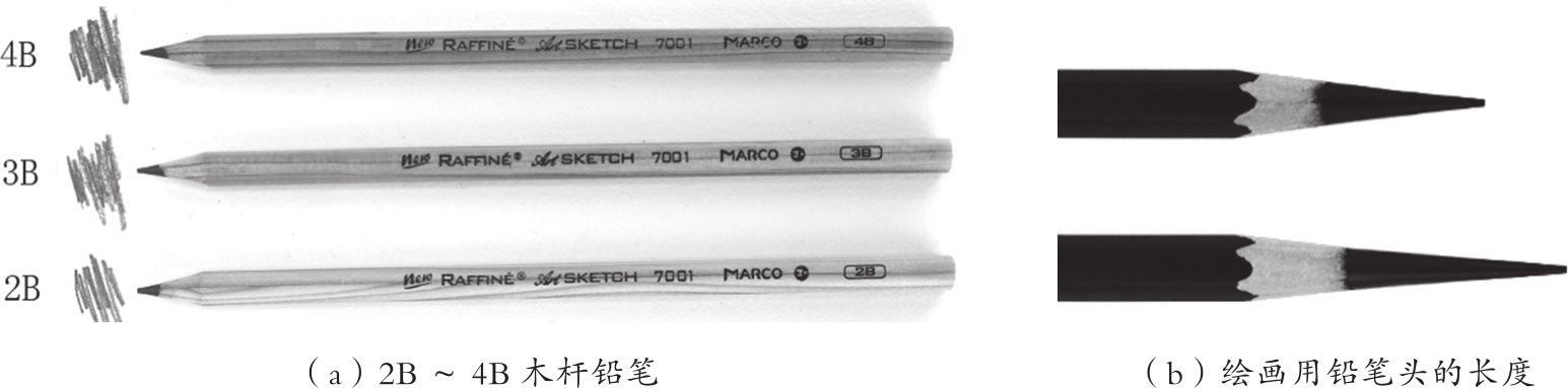 建议使用2B~4B木杆铅笔,字母B前数字越大,笔芯越黑、越软,如图1-7(a)所示。不建议使用自动铅笔,因为起形时动作幅度大、画线长、握笔姿势与写字有所不同,所以要求速写的木杆铅笔笔芯的外露部分比写字时长,如图1-7(b)所示。而由于自动铅笔的笔芯露出部分较短,在起形时会限制绘画的动作,影响起形的感觉与准确性,因此不宜用自动铅笔起形。