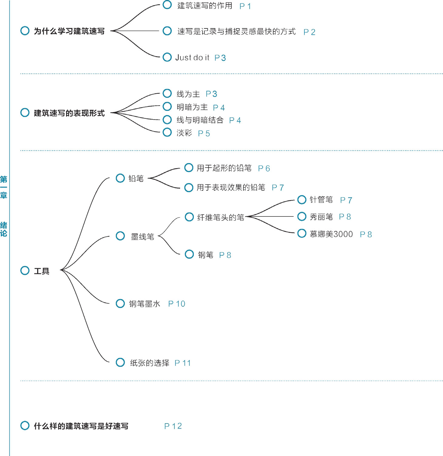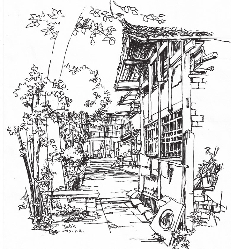 初学者的各项技能都还处于起步阶段——透视关系“烧脑”、物体不知如何表达,甚至连线都画得歪七扭八,要完成一幅建筑速写,尤其是写生,已经是举步维艰。因此,学习建筑速写应该抱着步步为营、各个击破的态度。初学时可以适当使用铅笔起稿辅助,尤其是在建筑结构较为复杂的情况下,初学者先使用铅笔画好透视关系,再进一步考虑线的表达和物体取舍等问题。如此能最大限度地减少心理压力,增加绘画成就感!等到后期透视关系烂熟于心,画面处理、物体表现都胸有成竹时,绘图者就可以不起铅笔稿而直接画线稿了。