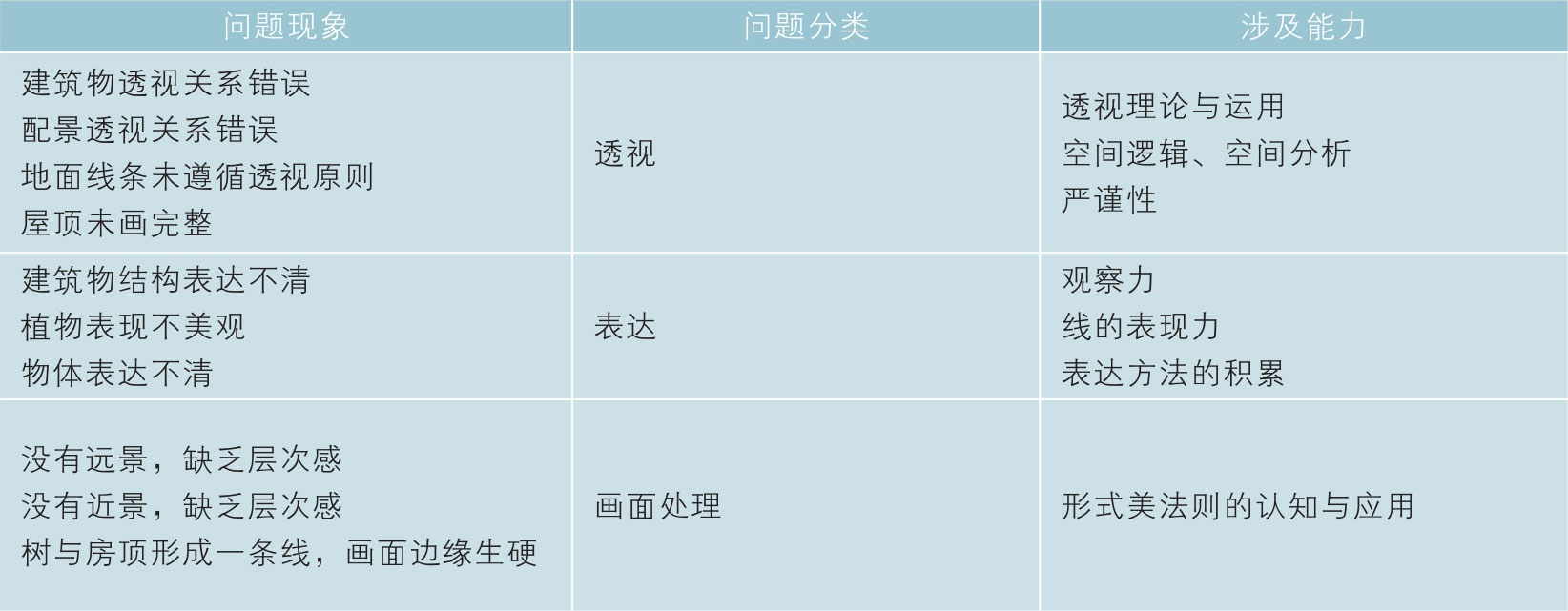 图中的问题基本是初学者出错频率最高的地方,这些问题可归纳为3类,如表1-1所示,同时这些问题涉及一些能力。因此同学们可以通过分析自己的画作找到自己能力缺失的地方并有针对性地进行学习和训练。这些问题和能力训练均会在本书后面的章节中一一进行讲解。