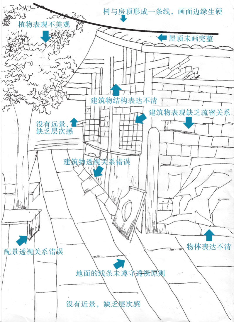 言归正传,下面从透视、线的表达、画面布局3个方面对图1-20进行分析,简单地点出了这幅图所存在的问题,如图1-21所示。希望这幅图能让大家简单感悟到画好一幅速写的要点。
