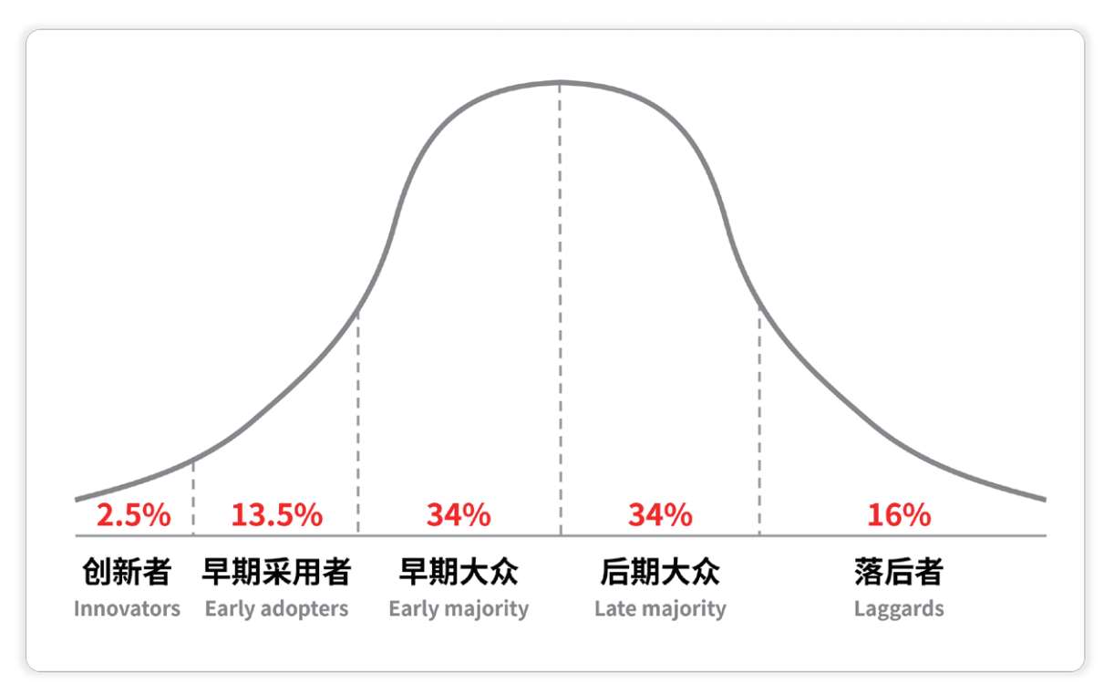 这就不得不提到E. M. 罗杰斯(E. M. Rogers)的 创新扩散理论 (图1-9)。简单来说,该理论阐述的是不同的人接受创新的速度是不一样的。按照接受创新的先后可以划分出5种不同类型的用户,分别是 创新者、早期采用者、早期大众、后期大众 以及 落后者 。