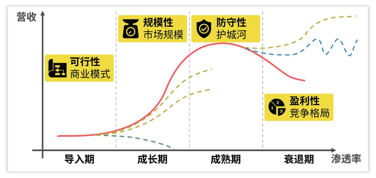 导入期的研究重点是商业模式的可行性,成长期的研究重点是市场规模(规模性),成熟期的研究重点是护城河(防守性)和竞争格局(盈利性),衰退期需要关注来自替代品的威胁