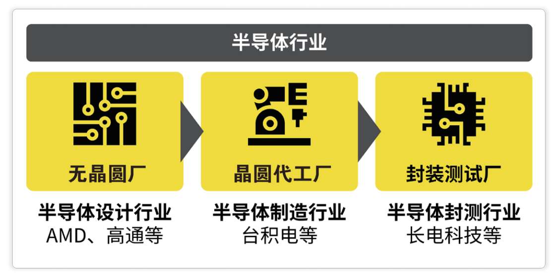 纵向来看(图1-2),如果我们把半导体产业链简化成“设计→制造→封测”这3个环节,且将每个环节对应一个细分行业,那么 半导体设计行业 有AMD、高通等, 半导体制造行业 有台积电等, 半导体封测行业 有长电科技等。它们的经济活动性质实际上有着不小的差别,其生产设备、核心竞争力等各不相同,但产业链的最终产出是半导体产品,因此我们可以说这几个细分行业都属于 半导体行业 。