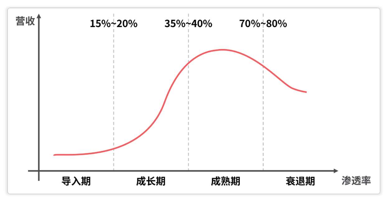 一个比较好的解决方案,是用 渗透率 作为划分产业生命周期不同阶段的依据。渗透率描述的是行业已经触达了多大比例的潜在用户,用公式表示就是 渗透率=存量用户÷潜在客户群 。