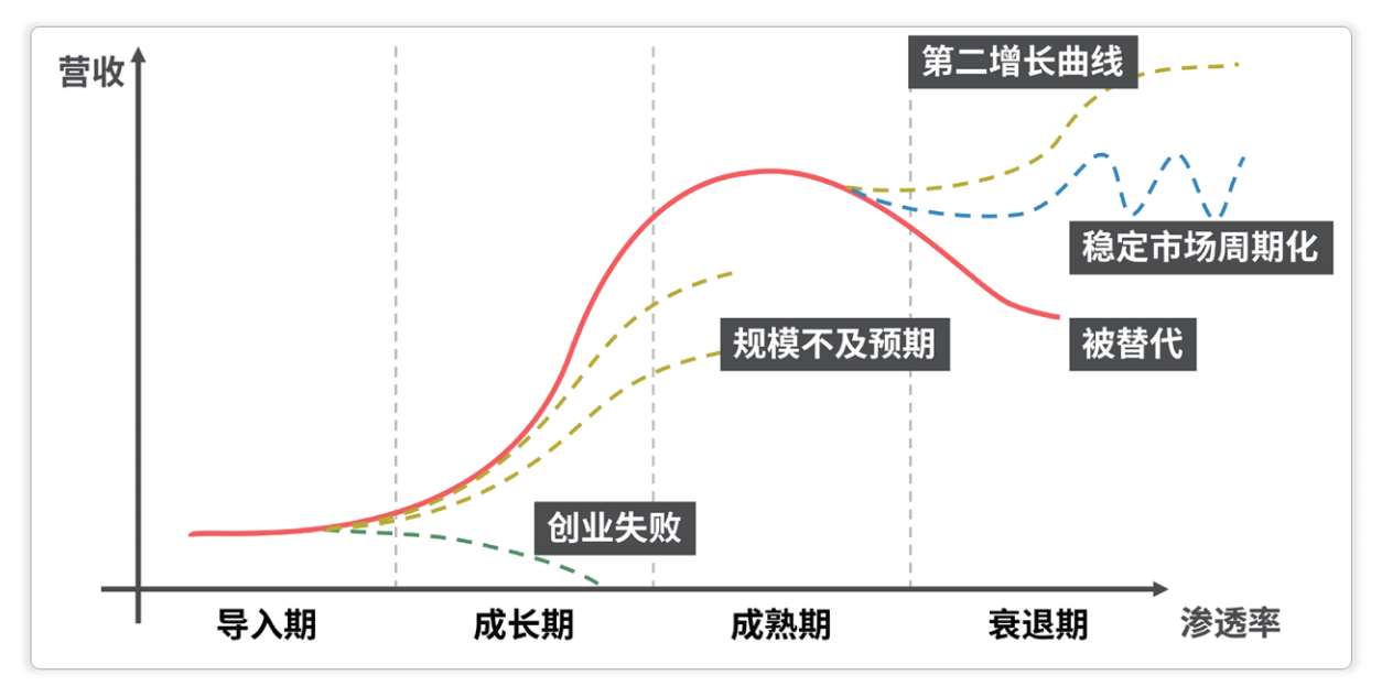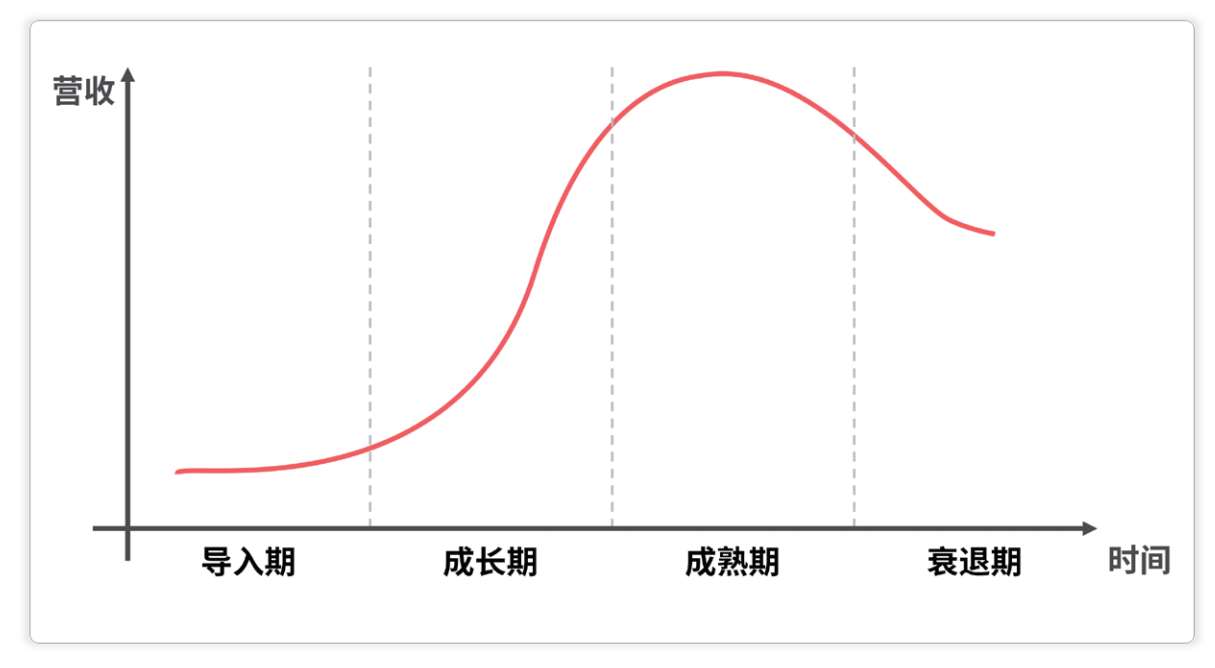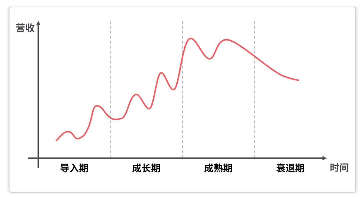 按照传统的产业生命周期理论,一个产业根据营收情况可以划分成4个阶段: 导入期、成长期、成熟期、衰退期 。之所以会有这种跟人类成长类似的生命周期,主要是因为客户群体的变化。