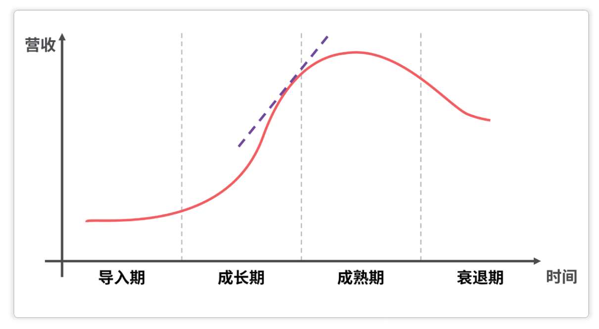 还有一种常见的思路,用产业生命周期理论中 曲线斜率 作为不同阶段的划分标准(图1-11)。当斜率从小到大变得越发陡峭的时候,营收增速越来越快、市场规模快速扩大,这说明行业从导入期进入了成长期;当斜率从大到小,逐渐放缓的时候,营收增速越来越慢、市场容量趋于饱和,这说明行业从成长期进入了成熟期。