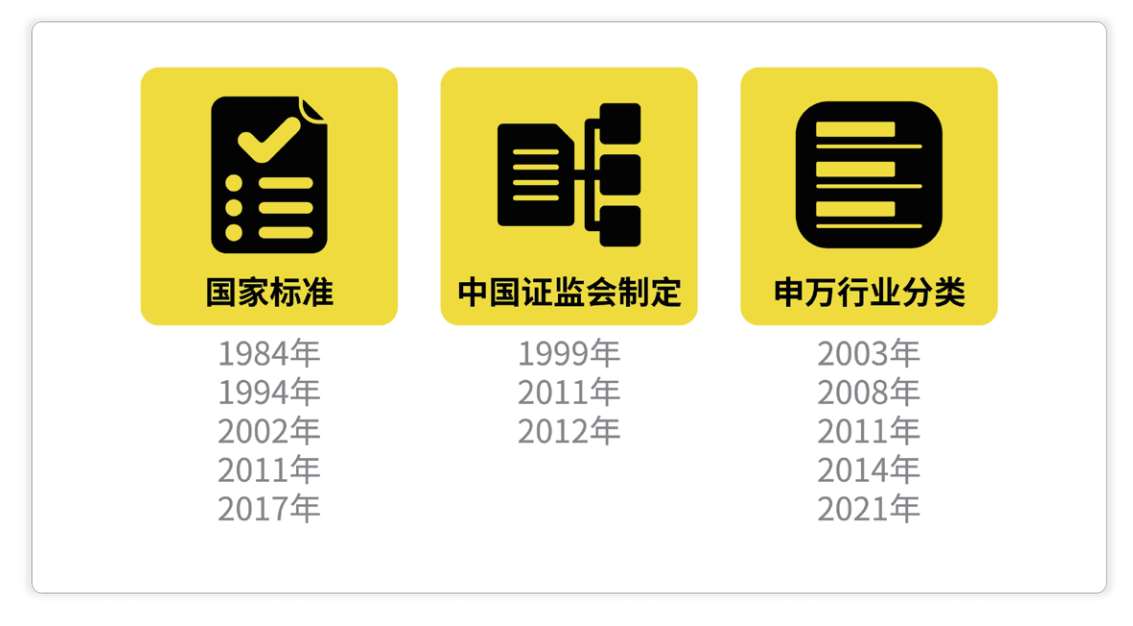 此外,随着社会经济的发展和变化,这些标准也会随之调整(图1-7)。比如中国证监会的《上市公司行业分类指引》最早的版本可以追溯到1999年,之后在2011年、2012年都修订过。《申万行业分类标准》也在2021年经历了一轮大调整,新增了医疗美容等新兴行业。