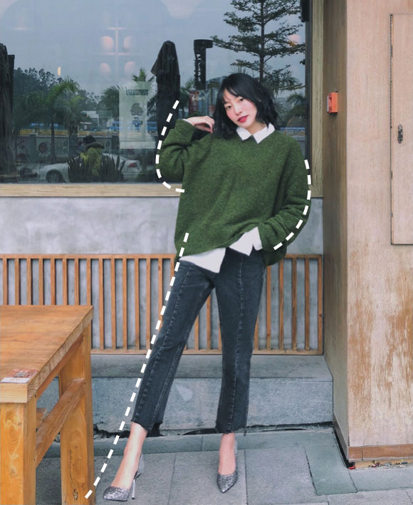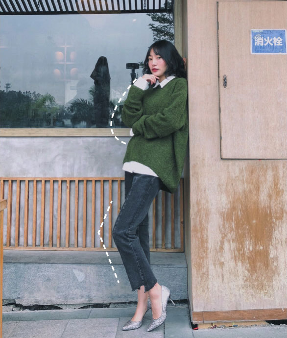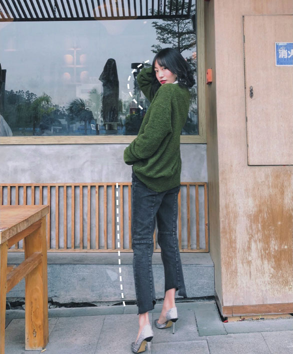 如果身边有墙或是栏杆,可以轻轻将身体倚靠上去,侧身摸下巴,一条腿略微弯曲,这样拍照显得轻松自然。
