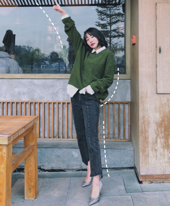 将身体舒展开,一只手伸直指向天空,另一只手可以随意插兜,这个姿势很显高!