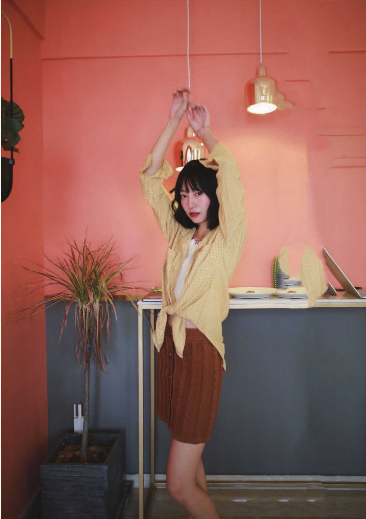 两只手都举过头顶,眼神飘忽,看向镜头,带着点小小的性感。
