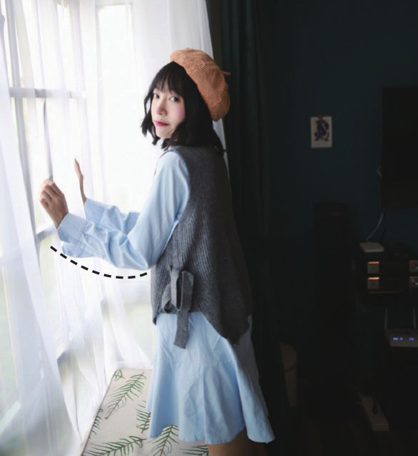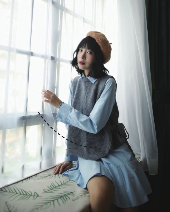 有了重心倚靠,可以让你的动作不那么僵硬刻板。双手撑在窗上,身体略前倾,自然地看向镜头就很好看。