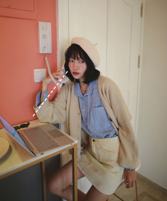 不管拿什么道具,身体的状态都会自然100倍!假装在打电话,眼睛不看镜头,抓拍那一瞬间的感觉。