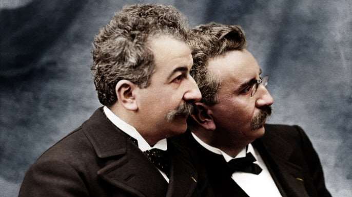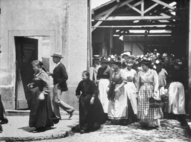 (2)电影摄影的开创与电子摄像的兴起时期:1895年,法国吕米埃兄弟(见图1-1-3)发明了第一台实用的电影摄像机,并拍摄了电影《工厂的大门》,如图1-1-4所示,这标志着电影时代的正式开启。早期电影采用胶片拍摄,通过放映机播放。到了20世纪初,光电摄像管等技术的发明推动了电子摄像技术的发展。1936年,英国广播公司播出了第一个电视节目,正式宣告电视时代的到来。