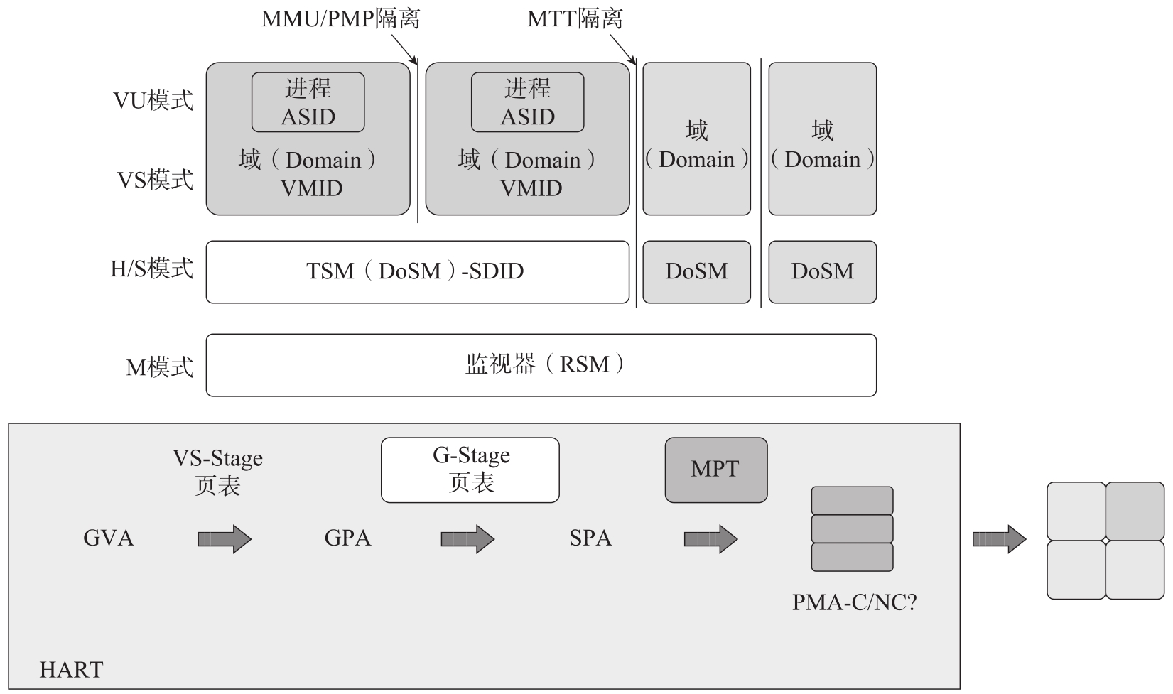 CoVE机密计算的内存安全管理由SmMPT规范“Memory tracking table for supervisor domain access protection specification”定义,如图3-18所示。首先,在一个Domain内部可以设立VS-Stage页表完成GVA到GPA的映射。其次,TSM建立G-Stage页表负责GPA到系统物理地址(System Physical Address,SPA)的映射。最后,CoVE的一个重要功能模块是 内存保护表 (Memory Protection Table,MPT)。每一个RISC-V的硬件线程(Hardware Thread,HART)会有MPT检查者(MPT Checker,MPTCHK)扩展,它和已有的基于页表的内存管理单元(Memory Management Unit,MMU)以及物理内存保护(Physical Memory Protection,PMP)机制一起工作。机器模式的软件使用MTT来创建一个隔离的环境,包括CPU状态和内存的隔离。MPT的另一个作用是指定物理内存属性(Physical Memory Attribute,PMA),TSM可以指定哪些是机密内存(Confidential,C)、哪些是非机密内存(Non-Confidential,NC)。