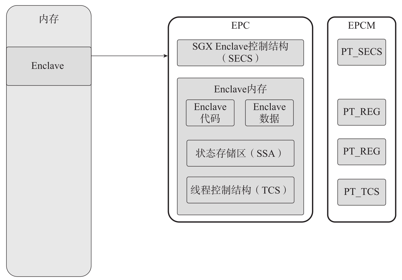 注意 根据上述的MEE设计和安全模型,MEE不需要设计成不经意RAM(Oblivious RAM,ORAM)。ORAM的概念由Goldreich和Ostrovsky在1996年的论文“Software protection and simulation on oblivious RAMs”中提出。ORAM是一种计算机模型,对于任意两组运行同样时间的输入,访问内存区域的序列是相同的,从而达到保护软件的目的。MEE允许攻击者追踪DRAM的改动、缓存行的访问地址等。