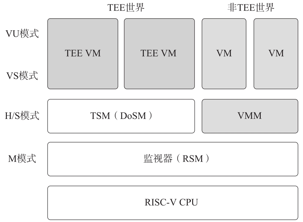 RISC-V标准化组织AP-TEE工作组在2023年起草了支持RISC-V架构的机密虚拟机方案,称为CoVE。RISC-V的CoVE方案类似于ARM CCA RME,不同之处在于RISC-V没有安全世界这一概念。CoVE将机密计算TEE称为TEE VM(TVM)或 域 (Domain),而且直接把保护和隔离TVM的模块称为TSM或 域安全管理器 (Domain Security Manager,DoSM)。机器模式或M模式(M-mode)的监视器或 根安全管理器 (Root Security Manager,RSM)负责切换TEE世界(TEE World)和非TEE世界(Non-TEE World)。RISC-V CoVE的架构如图3-17所示。