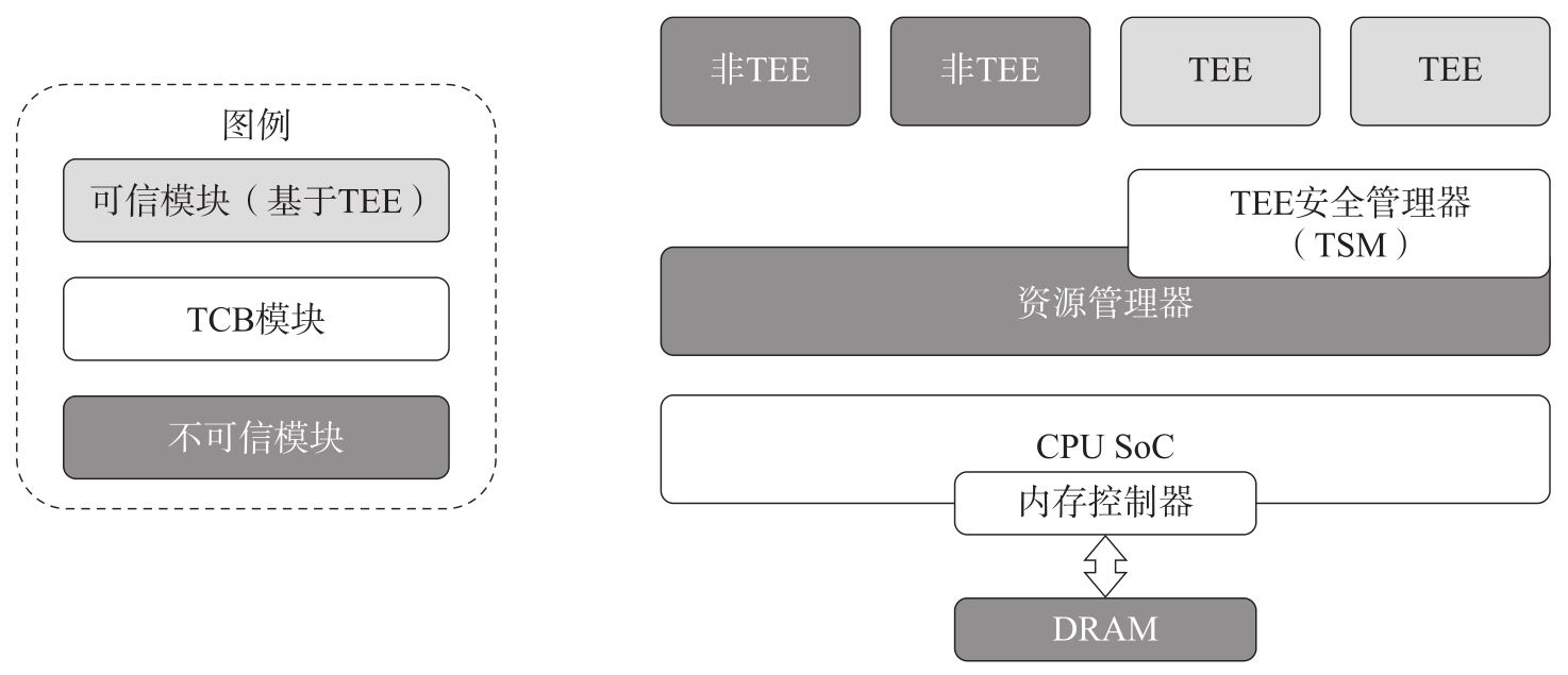 首先,系统的CPU和内存控制器必须是可信的,因为它们是进行计算的基础,必须是TEE TCB的一部分。DRAM可以是不可信的,因为MC可以自带内存加密引擎(MEE)并把加密的内容存储到DRAM中。Gueron在2016年的论文“A memory encryption engine suitable for general purpose processors”中介绍了通用MEE的设计以及安全模型,MEE的安全目标有: