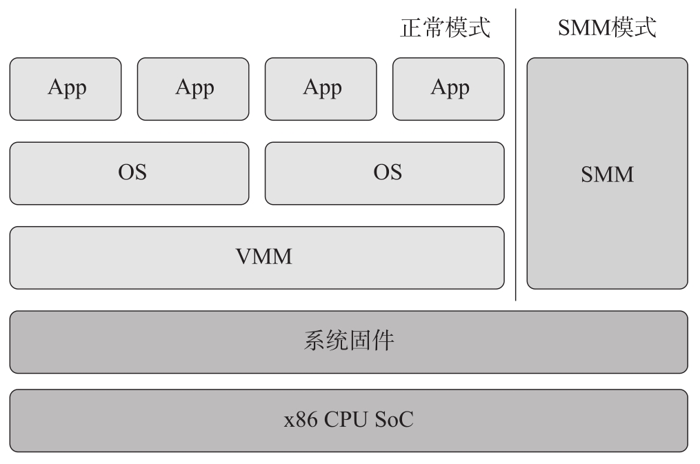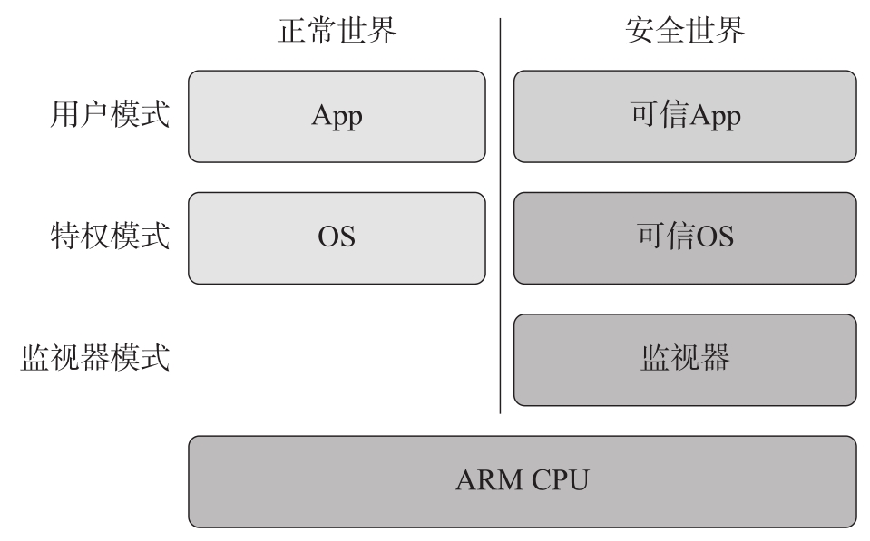 这里我们单独讨论 可用性 ,目的是说明机密计算TEE的权限问题。广义上说,只要是一个独立可信的执行环境,都可以称为TEE。TEE可以有最高的系统权限,会影响系统可用性;也可以有最小的系统权限,只保护一小部分用户态应用程序。例如,Intel早在386SL处理器中就提出了系统管理模式(System Management Mode,SMM),如图3-3所示。但是,SMM具有最高的系统优先级,甚至可以超过VMM,那么把SMM作为通用TEE就不是一个合适的选择。同样,ARM在ARMv6KZ引入的TrustZone就是一个创建安全世界(Secure World)TEE的安全技术,如图3-4所示。其中,监视器模式(Monitor-mode)的TrustZone监视器软件具有最高的权限,这就意味着,如果把这类TEE作为机密计算TEE,就赋予了这个执行环境所不需要的权限,违反了Saltzer和Schroeder早在1975年发表的“The protection of information in computer systems”中提出的计算机安全保护的最小权限(Least Privilege)原则。Smith在2012年的文章“A contemporary look at Saltzer and Schroeder's 1975 design principles”中重新审视了这些设计原则,最小权限原则依然重要。因此,这不是机密计算TEE最佳的选择。