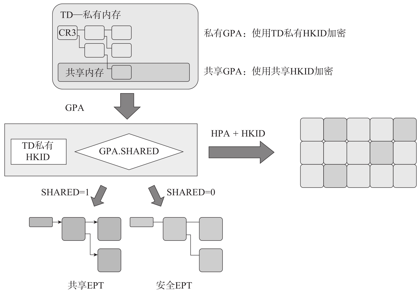 图3-1展示了一个基于TEE的机密计算通用架构模型。我们用白色框表示TEE可信计算基(Trusted Computing Base,TCB),浅灰色框表示TEE自身,深灰色框表示不可信的模块。