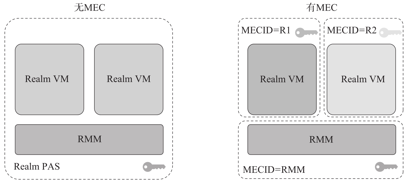ARM CCA RME的架构中引入了内存加密上下文(Memory Encryption Context,MEC)扩展。在没有MEC的时候,每个世界中只有一个根据PAS衍生出的加密密钥,虽然Realm世界和安全世界以及Root世界使用不同的加密密钥,但是每个Realm都使用相同的加密密钥,Realm之间的隔离由RMM完成。MEC存在的时候,一个Realm世界中可以有多个根据 MEC标识符 (MEC Identifier,MECID)衍生出的加密密钥,这样RMM和每一个Realm都有自己的加密密钥,满足纵深防御的要求。如图3-16所示,左图表示没有MEC的情况,右图表示有MEC的情况,虚线框表示同一密钥的加密边界。