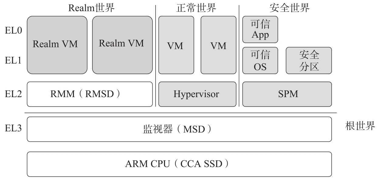 (Realm Management Security Domain,RMSD):包括在Realm世界运行的所有固件,负责隔离保护每个Realm VM。RMSD是Realm VM的TCB的一部分,充当TSM的角色,被Realm VM所信任。