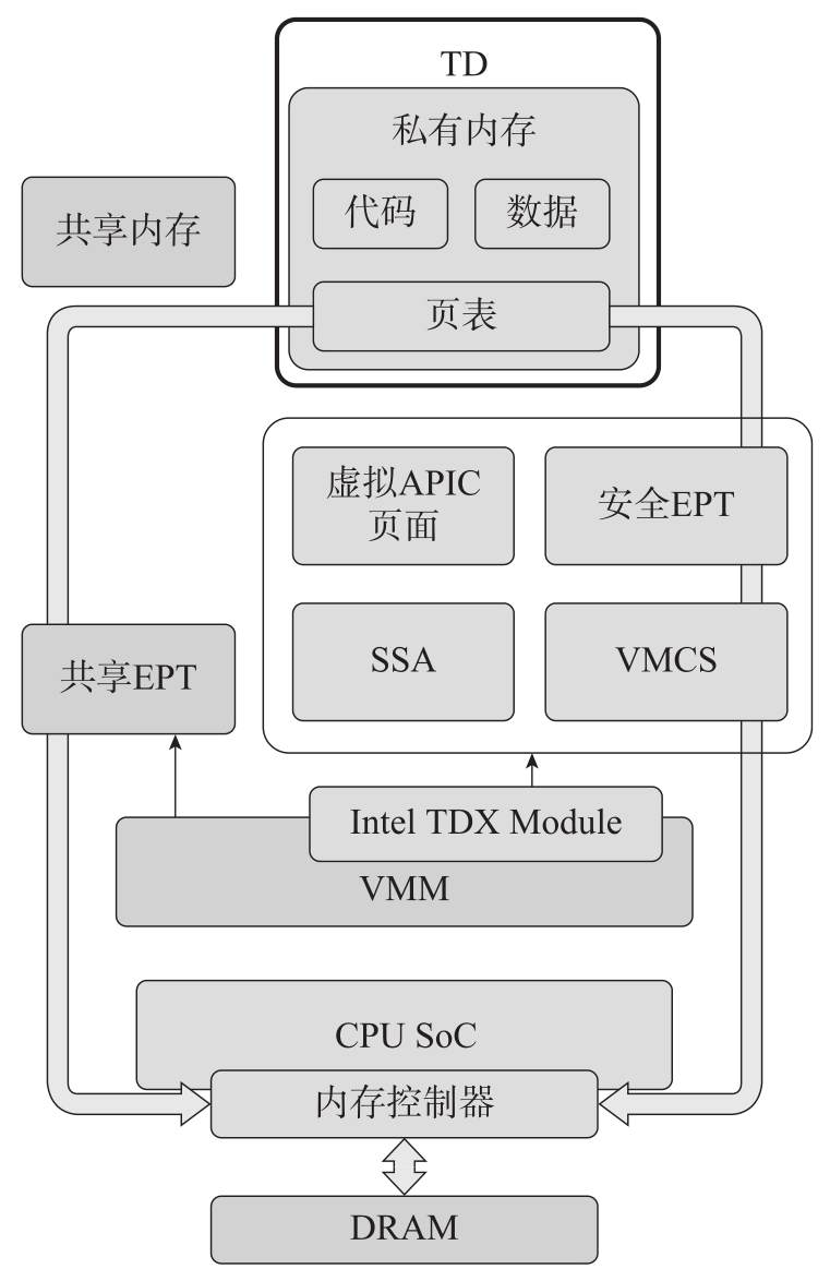 :这里的系统软件包括具有系统管理员权限的内部攻击者以及VMM、普通VM、其他TD、BIOS(包括系统管理模式)等具有系统权限的软件,它们可以启动其他可能有恶意软件的模块。例如,攻击者可以尝试直接访问TD的私有内存、注入私有内存、执行私有内存、修改CPU状态、使用直接内存访问(Direct Memory Access,DMA)引擎、利用EPT页表、内存重映射、触发内存别名(Alias)访问、注入虚拟中断等方法来获取TD中的机密信息。TDX可以防止以上所列的系统软件攻击,包括不同TD之间和同一个TD的对于私有内存的软件抓取-重放(Capture and Replay)攻击。