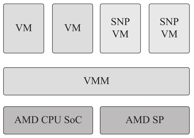 在SEV-SNP机密虚拟机系统中,每个SNP VM就是一个机密计算TEE。管理SNP VM的工作由AMD安全处理器(AMD Secure Processor,AMD-SP)的硬件模块完成,也就是说,AMD-SP充当了硬件TSM的角色。AMD-SP和AMD CPU SoC都是SEV-SNP方案的TCB模块,如图3-12所示。