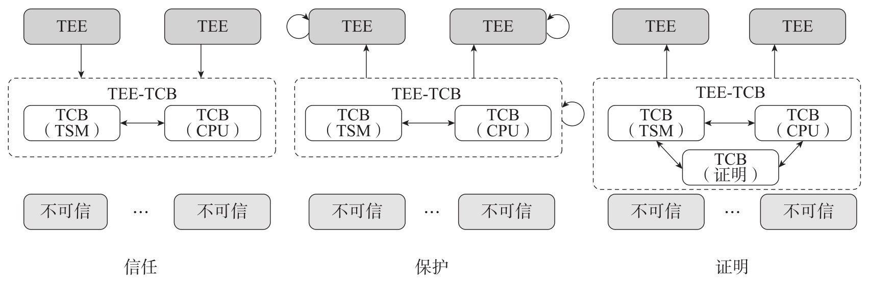 :系统各个TEE-TCB之间的信任关系由系统架构决定;TEE可以信任所有TEE-TCB,但是多个TEE之间不能互相信任。