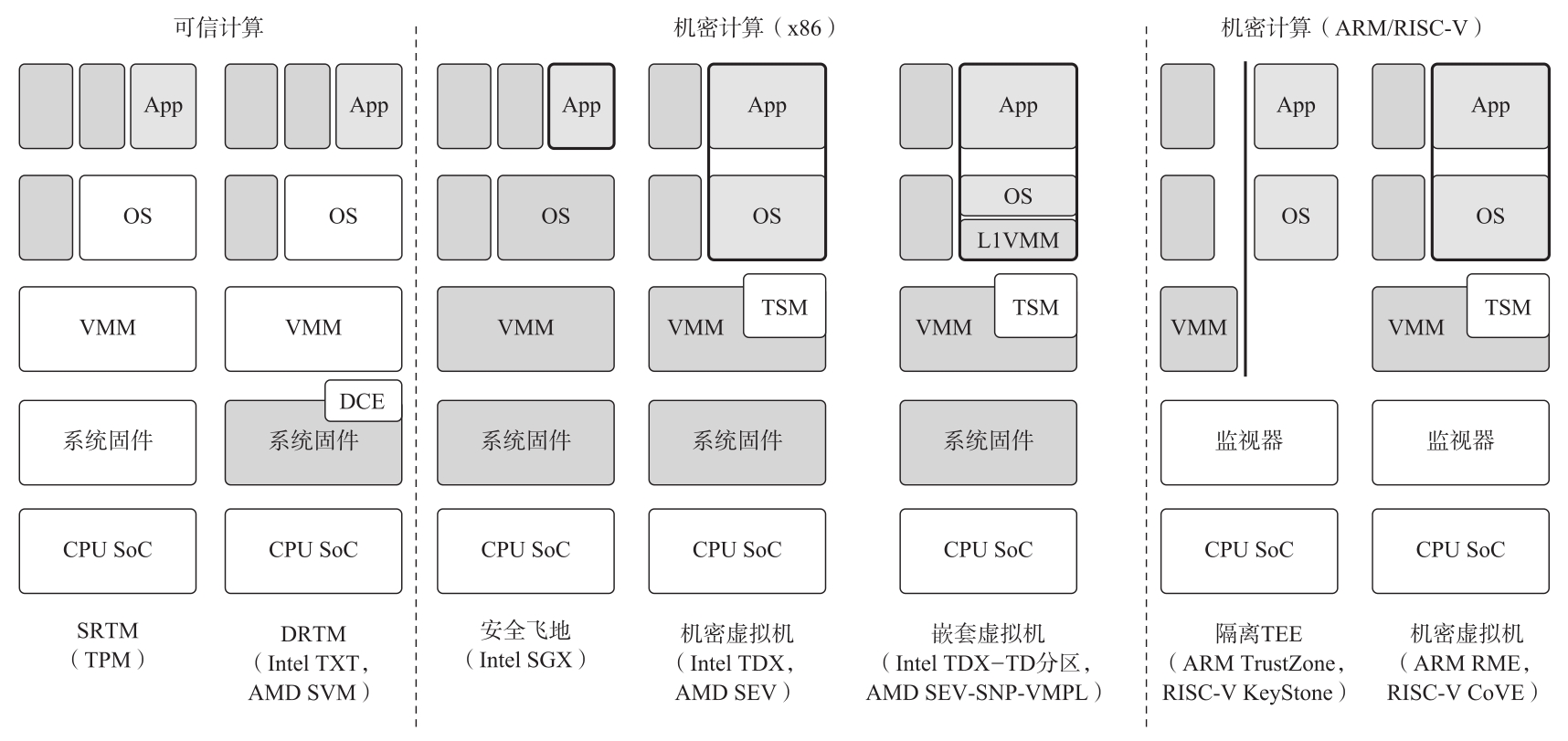 图3-6 可信计算和各种机密计算TEE架构