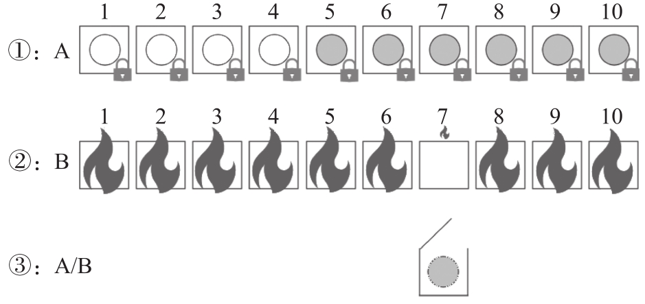 两个富翁希望能比一比谁的钱更多,但是他们又各有小心思,不想暴露自己财富的数额,该怎么办呢?这就是图灵奖得主姚期智院士在1982年提出的百万富翁难题。我们来看一个简化版本的方案。假设两个富翁的财富在1~10之间,那么可以按以下步骤处理。①富翁A找来10个一模一样的盒子,盒子外壳分别贴上标签1~10,然后在盒子里放入两种颜色的小球,白色小球代表财富值小于或等于A,灰色小球代表财富值大于A,之后锁上箱子交给富翁B。②富翁B打不开盒子,只能根据10个盒子外的标签选择和自己财富值对应的盒子,然后销毁其他9个盒子,再销毁唯一选定的盒子的标签,还给富翁A。③富翁A和富翁B一起打开选定的盒子,若是灰球,则富翁B的财富更多;若是白球,则富翁A的财富更多。由于富翁B不能打开盒子,因此富翁B不知道富翁A的财富值。由于富翁B销毁了其他盒子,并且撕去了选定盒子上的标签,因此富翁A不知道富翁B的财富。他们得到了比较结果,而且没有暴露自己的财富值。图0-1展示了富翁A的财富为4,富翁B的财富为7的例子,灰球表示富翁B的财富更多。