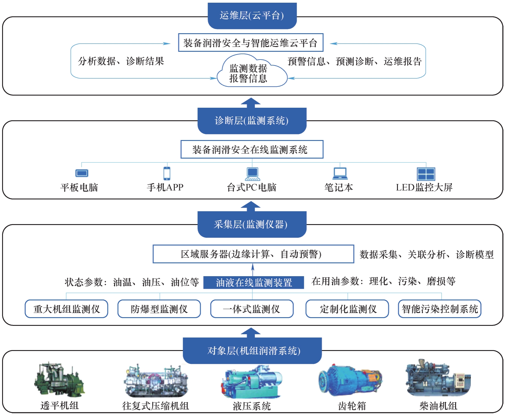 以工业互联网为平台的油液在线监测系统架构主要由4层组成(见图1-3),分别是对象层,即选定的监测机组润滑系统;采集层,即根据监测对象配置的油液监测仪器;诊断层,即监控诊断软件系统;运维层,即实现远程运维的云平台。