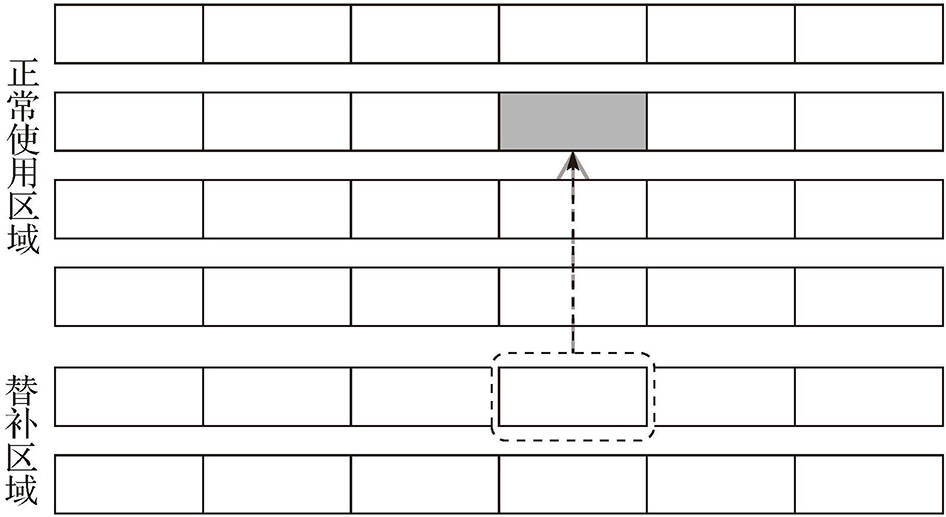 有的SSD固件设计中会对坏块的物理位置进行逻辑意义上的替换,即使用另外一个位置的好块替换当前超级块中的坏块,这样就可以降低超级块的管理复杂度。测试人员在设计相应测试用例时,需要留意类似的固件设计。图1-4是一个带有上述替换功能的固件设计示意图,图中当前超级块中的灰色坏块被替补区域的一个正常块所替换。