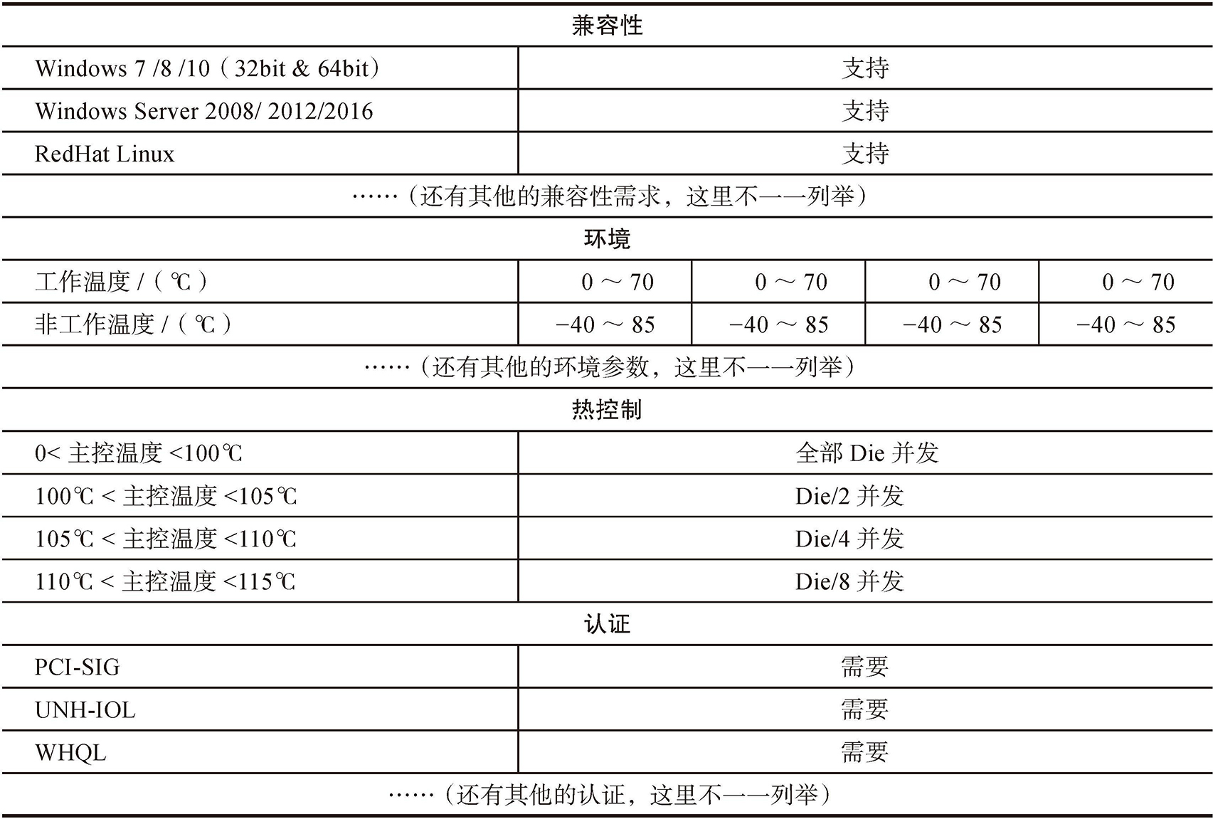一款SSD产品的PRD内容往往包括几百项内容,可以按照功能特性分类进行管理。在管理方法上,可以使用Excel表的不同sheet管理不同类别的特性,也可以使用文档分章节描述不同类别的特性。无论采用哪种模式,在PRD文档的首页都需要总体呈现该款SSD产品的关键性指标列表。