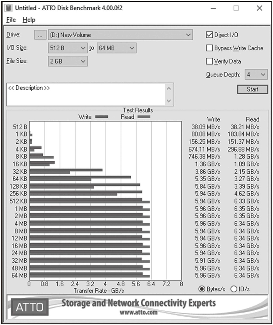 ATTO Disk Benchmark是一款可以用于测试SSD读取和写入速度的软件。使用该软件,可以清晰地了解不同IO文件大小对磁盘读取和写入速度的影响,测试数据以柱状图的形式呈现。ATTO Disk Benchmark测试的内容如图2-10所示。