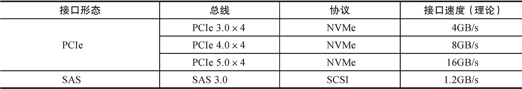 表2-13~表2-15列出了SATA 3.0、PCIe3.0/4.0/5.0、SAS 3.0的主要参数。对SSD进行性能测试时,需考虑实测结果是否符合各类接口的理论性能。