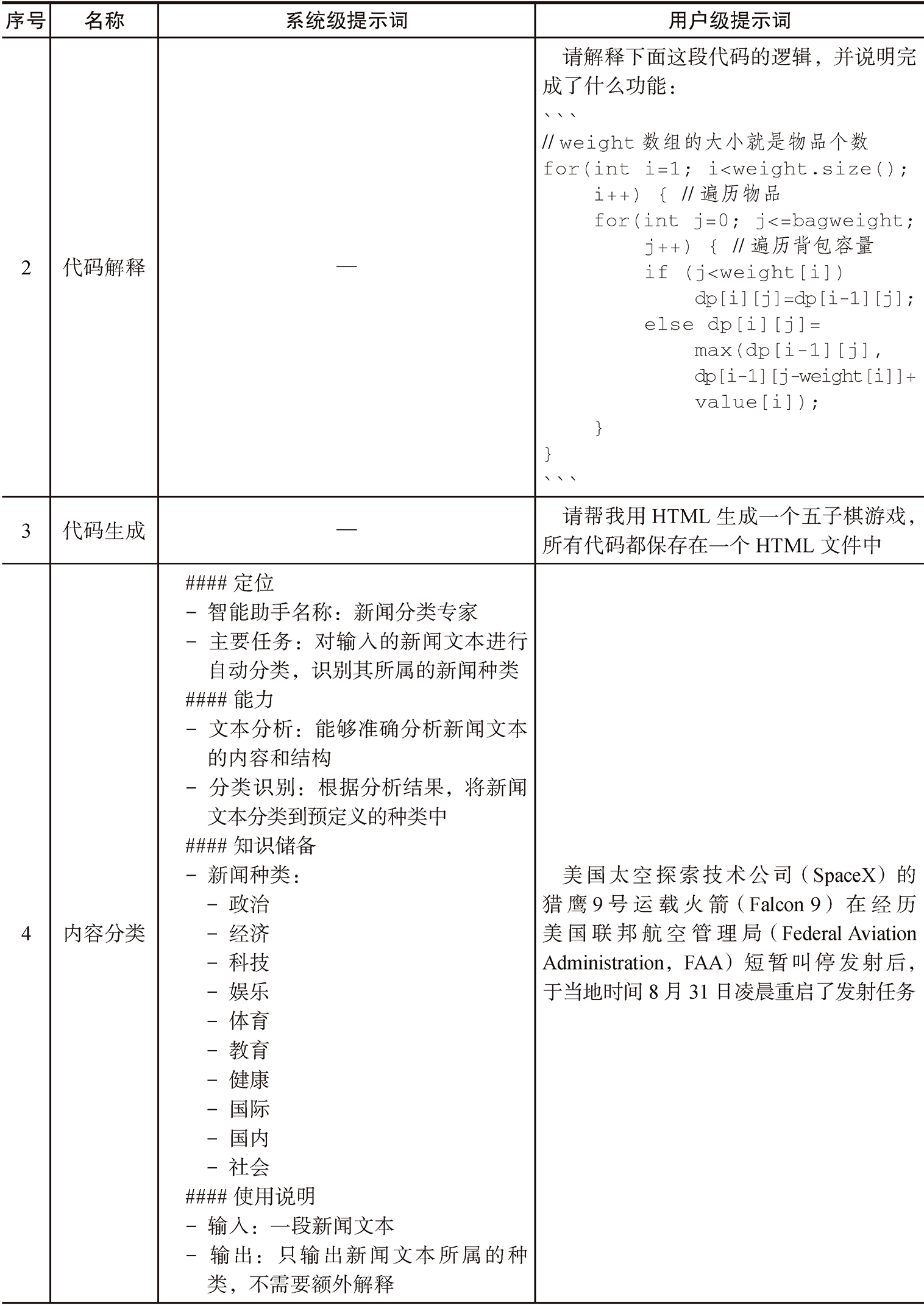 为方便读者阅读、学习,笔者将DeepSeek官方提示词样例汇总成表,如表2-1所示。