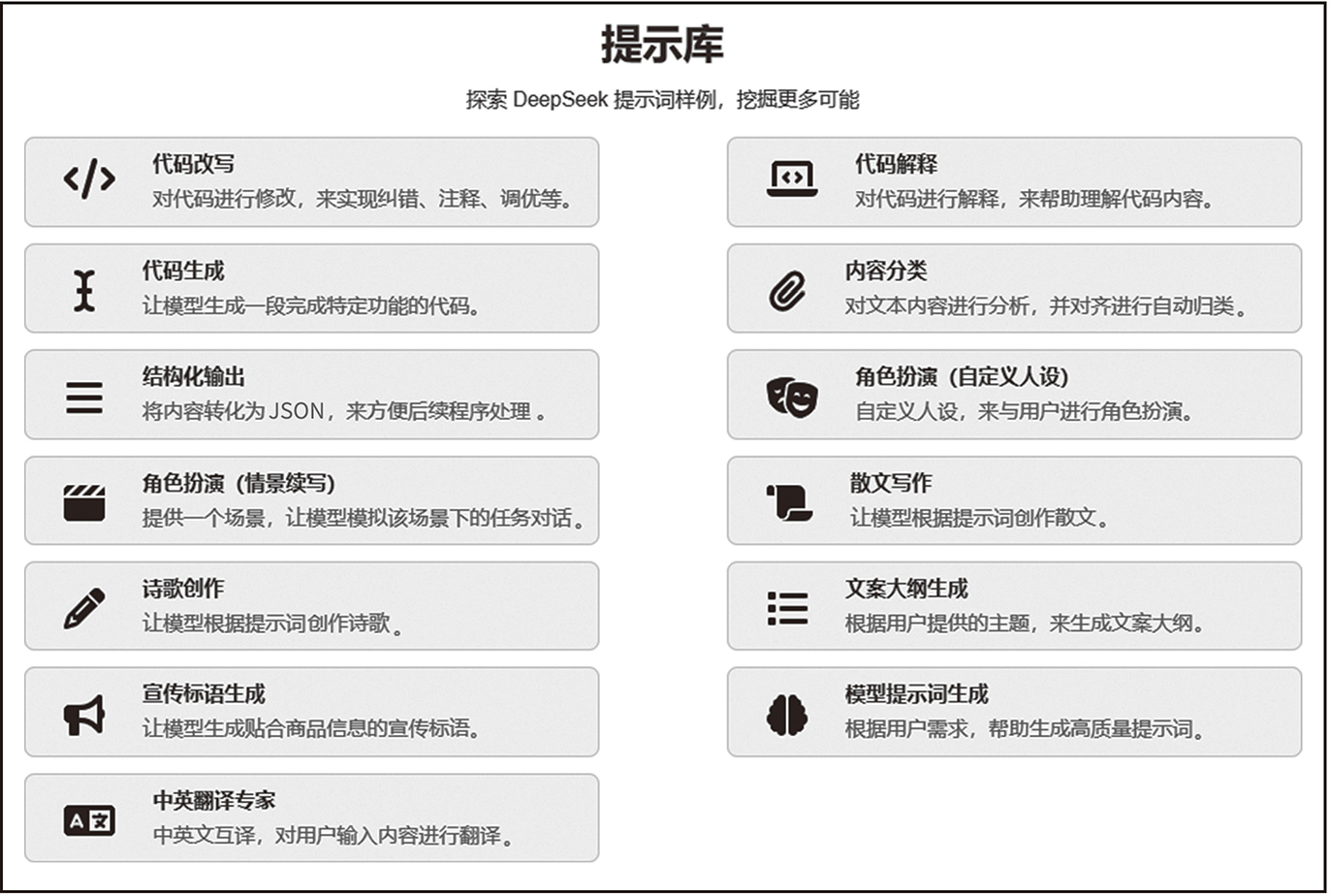 如图2-3所示,DeepSeek提供的13个提示词样例覆盖了常见的应用场景,它们是学习和掌握DeepSeek能力的重要资源,建议仔细研读这些样例,并尝试进行修改和扩展,探索DeepSeek的更多可能性。接下来,我们就对官方提示词进行详细解析。