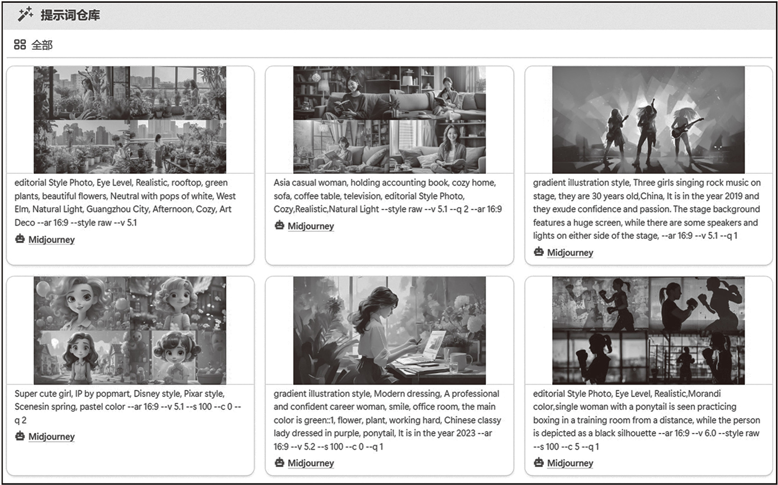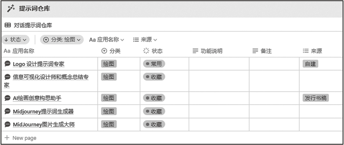 如图2-7所示,该图展示的是笔者使用Notion搭建的文字对话提示词仓库;如图2-8所示,该图展示的是笔者搭建的AI绘图提示词仓库。