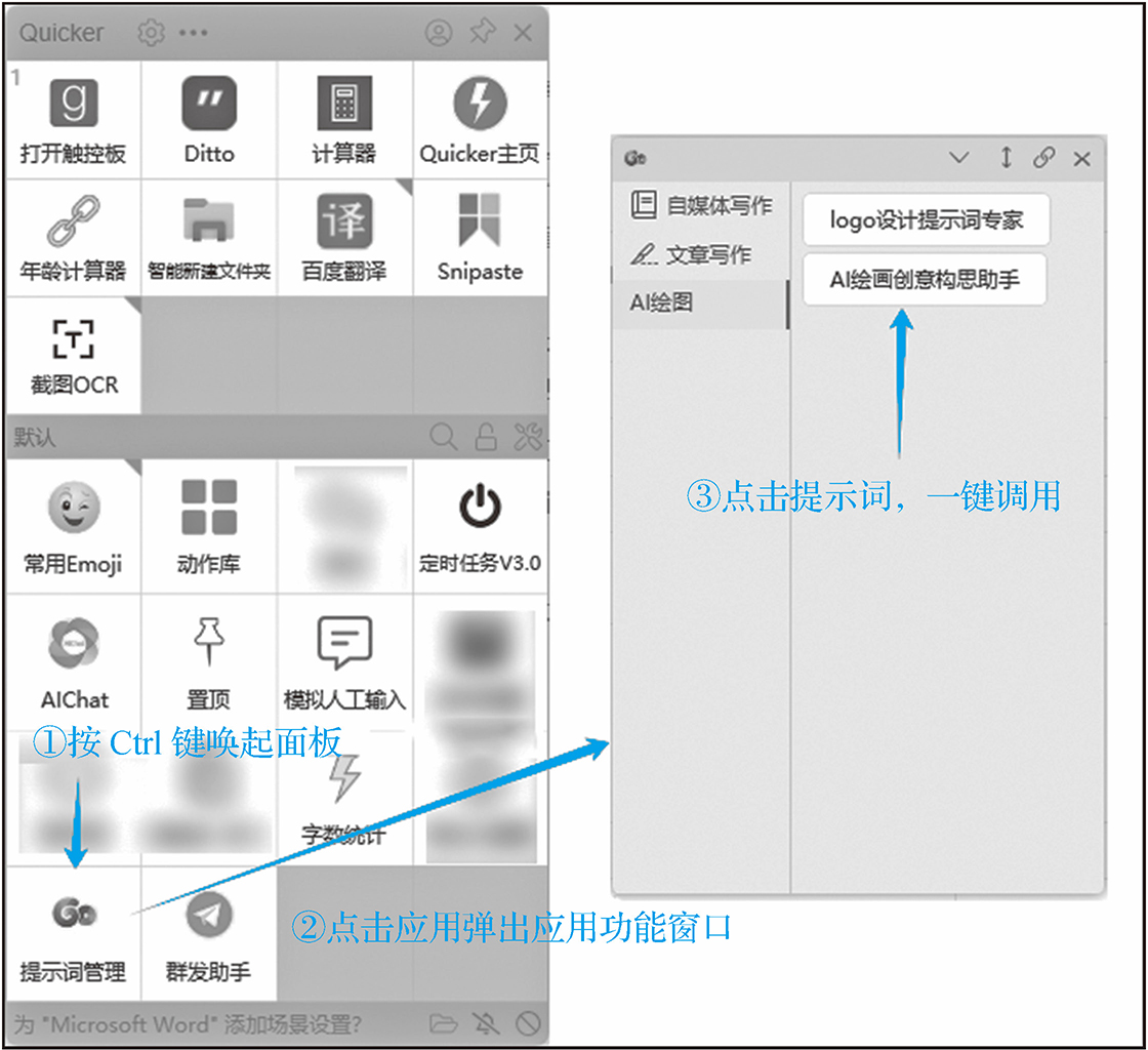 如图2-9所示,这是笔者在Quicker中构建的提示词管理应用。使用Ctrl键唤起Quicker面板之后,即可快捷调用提示词库。