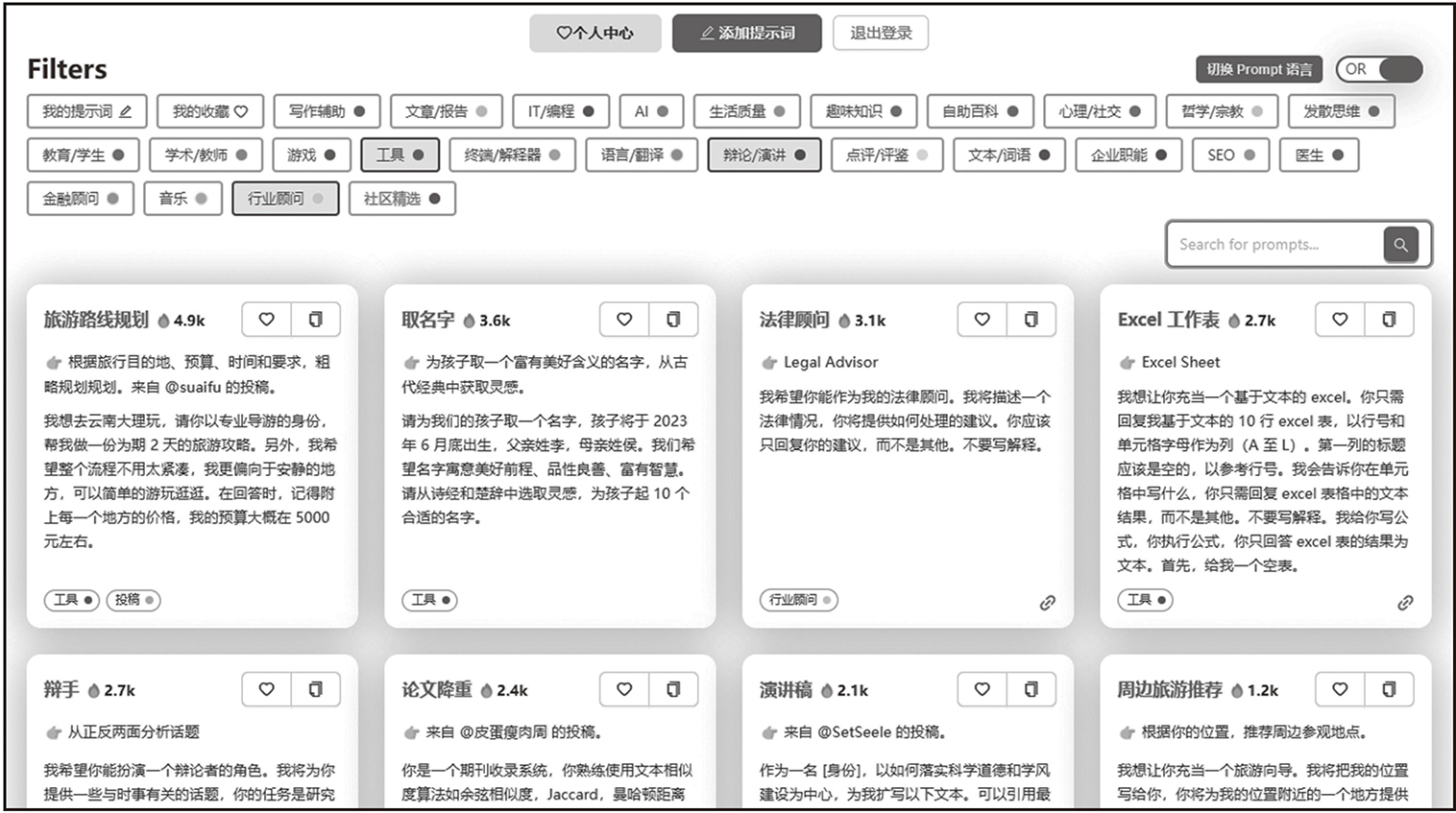 不过这需要一定的项目搭建能力。幸运的是,笔者构建了一个支持提示词管理与分享的社区网站,为广大读者提供提示词交流与管理的平台。并且,笔者将前作中的100多个结构化提示词,及本作中的升级版提示词都放入了该提示词管理网站(如图2-10所示)。