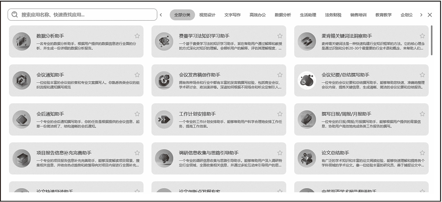 如图2-11所示,这是笔者基于开源项目搭建的ChatUI智能体应用广场。
