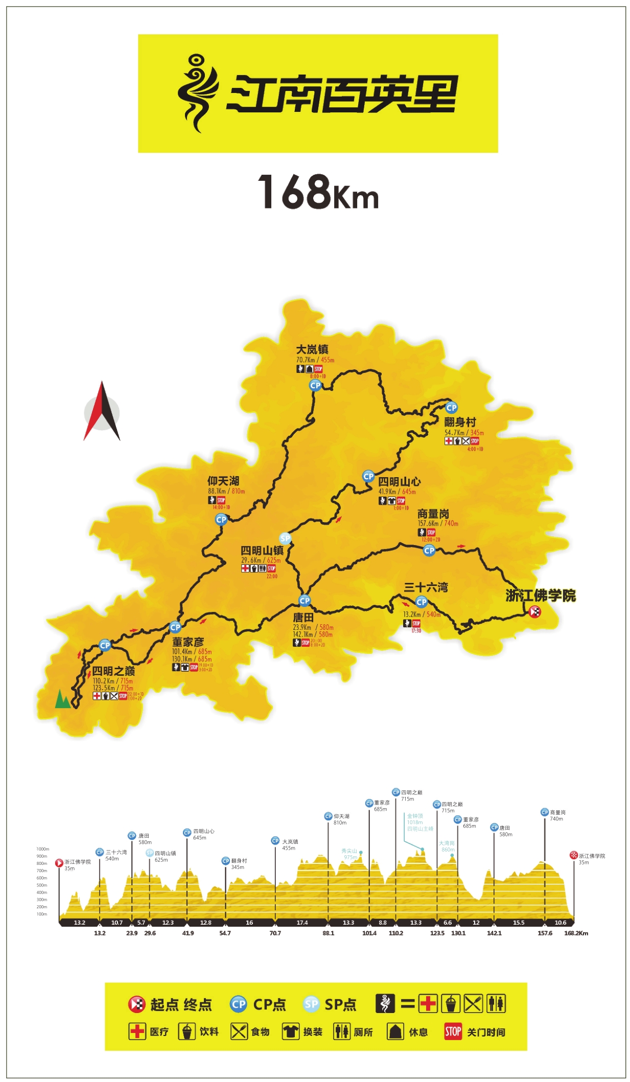 江南百英里168公里组别的赛道路线和海拔爬升图