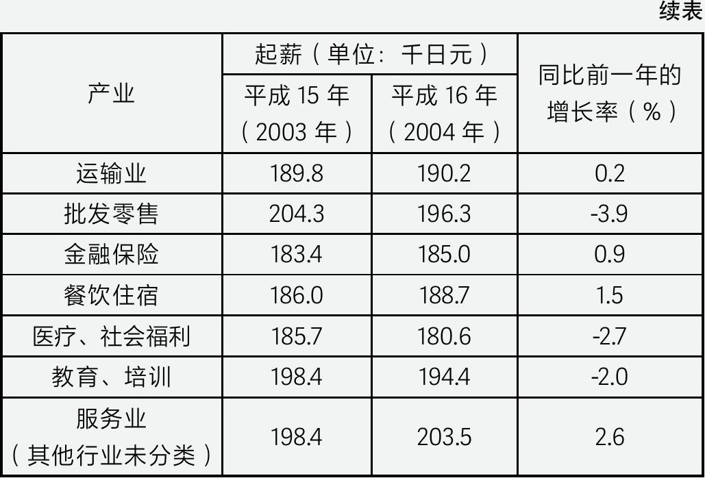 表一 平成15年,银行破产潮后各行业应届生起薪