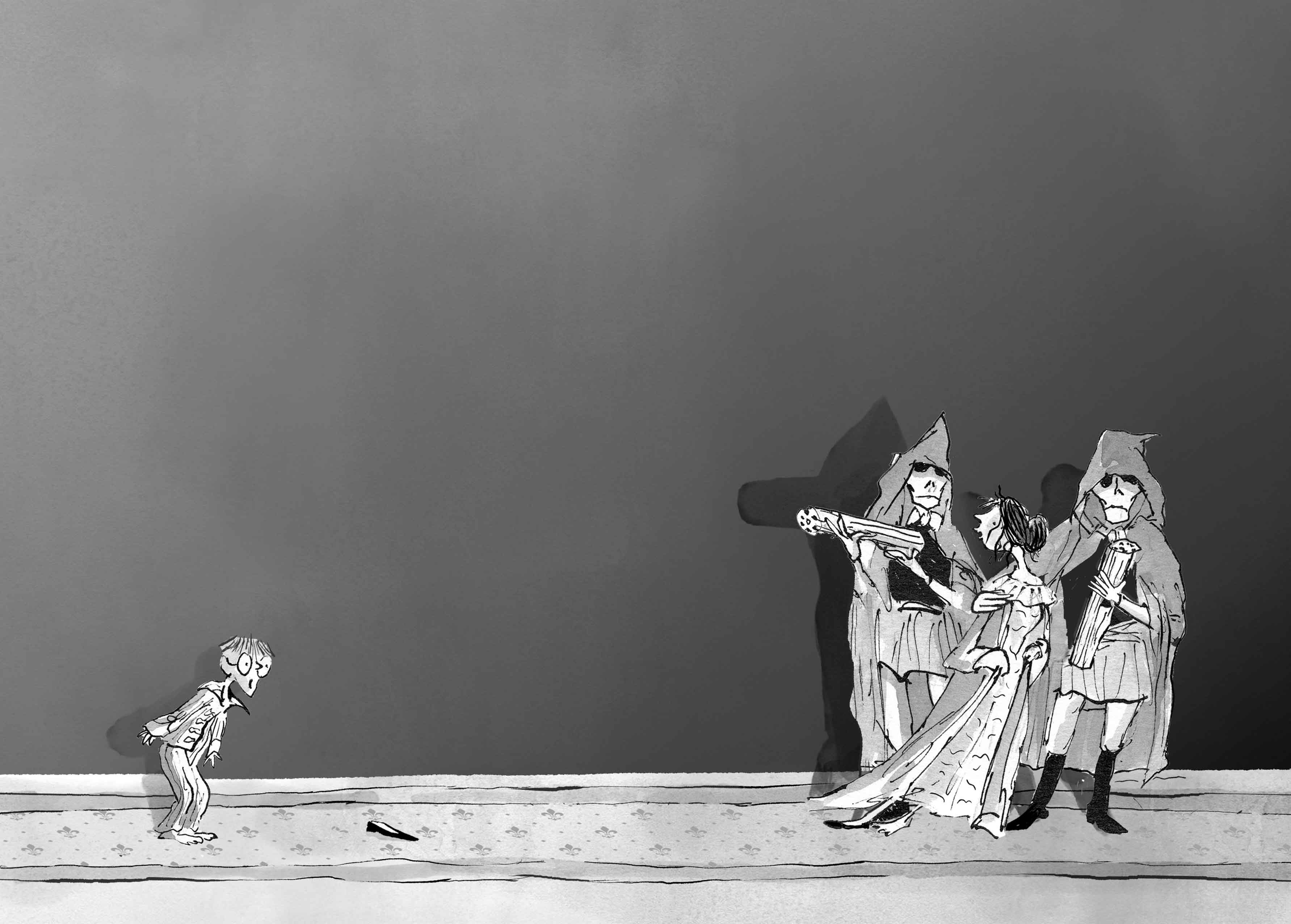 卫兵们的面容隐在面具后面,完全看不出表情。他们始终一言不发,眼前这一幕越发像个噩梦了。