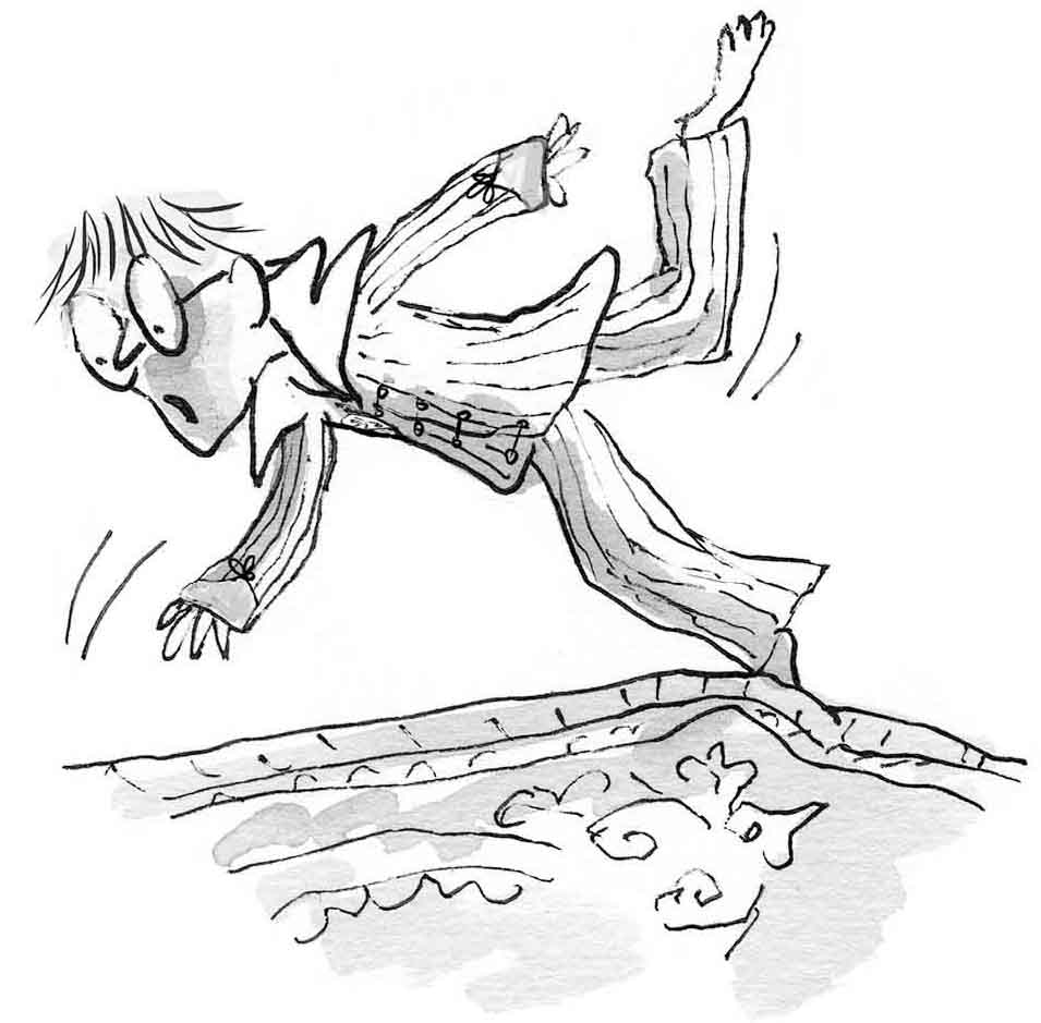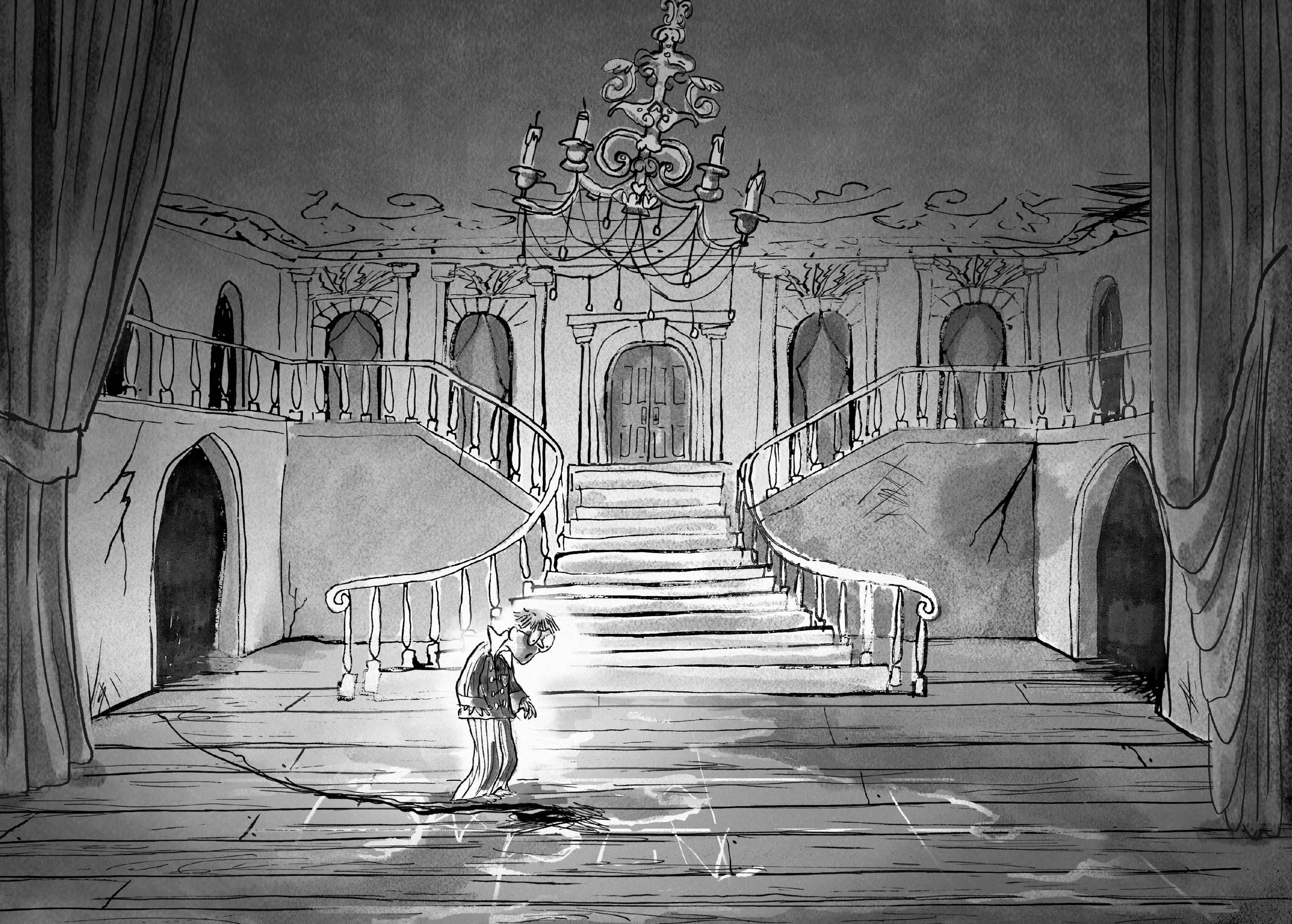他数到一百,轻轻地拉开了卧室门,向四周瞥了瞥,确定周围没人。现在走廊上只有他一个人,他蹑手蹑脚地穿过走廊,用尽全力冲下长长一段楼梯,跑到舞厅门口。就在这舞厅里,曾经举办过无数场热闹的派对。如今,舞厅空荡荡的,又破又旧,就像间鬼屋。一条晃晃悠悠的电线上挂着一个吊灯,丝绸窗帘掉下来拖了一地,潮气在墙上留下了暗色的丑陋霉斑。阿尔弗雷德总归是弱不禁风,他太累了,又一次左脚绊右脚来了个结结实实的平地摔。