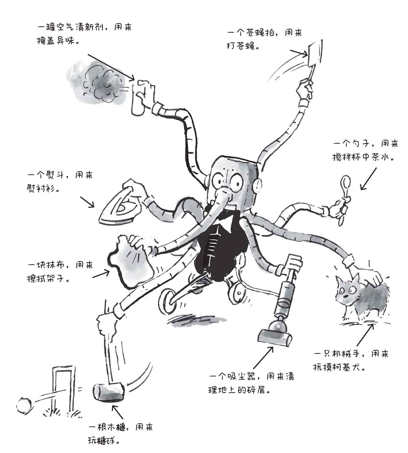设计八爪管家这个机器人,本来是为了让它包办管家的工作,让生活更方便点儿。但它的存在实际上让生活更困难了。困难太多了。它看起来还是挺像八爪鱼的——如果八爪鱼是金属做的,还能在地上滚的话。不过,它确实把握住了“八爪”这个主要特征。它有八条机械手臂,每一条都有不同的特殊用处,“八爪管家”因此得名——“八爪”是“八爪鱼”的“八爪”,“管家”是“人类管家”的“管家”。尽管平时人们叫它名字,那发音听起来更像“八爪屁股”——八爪鱼的屁股