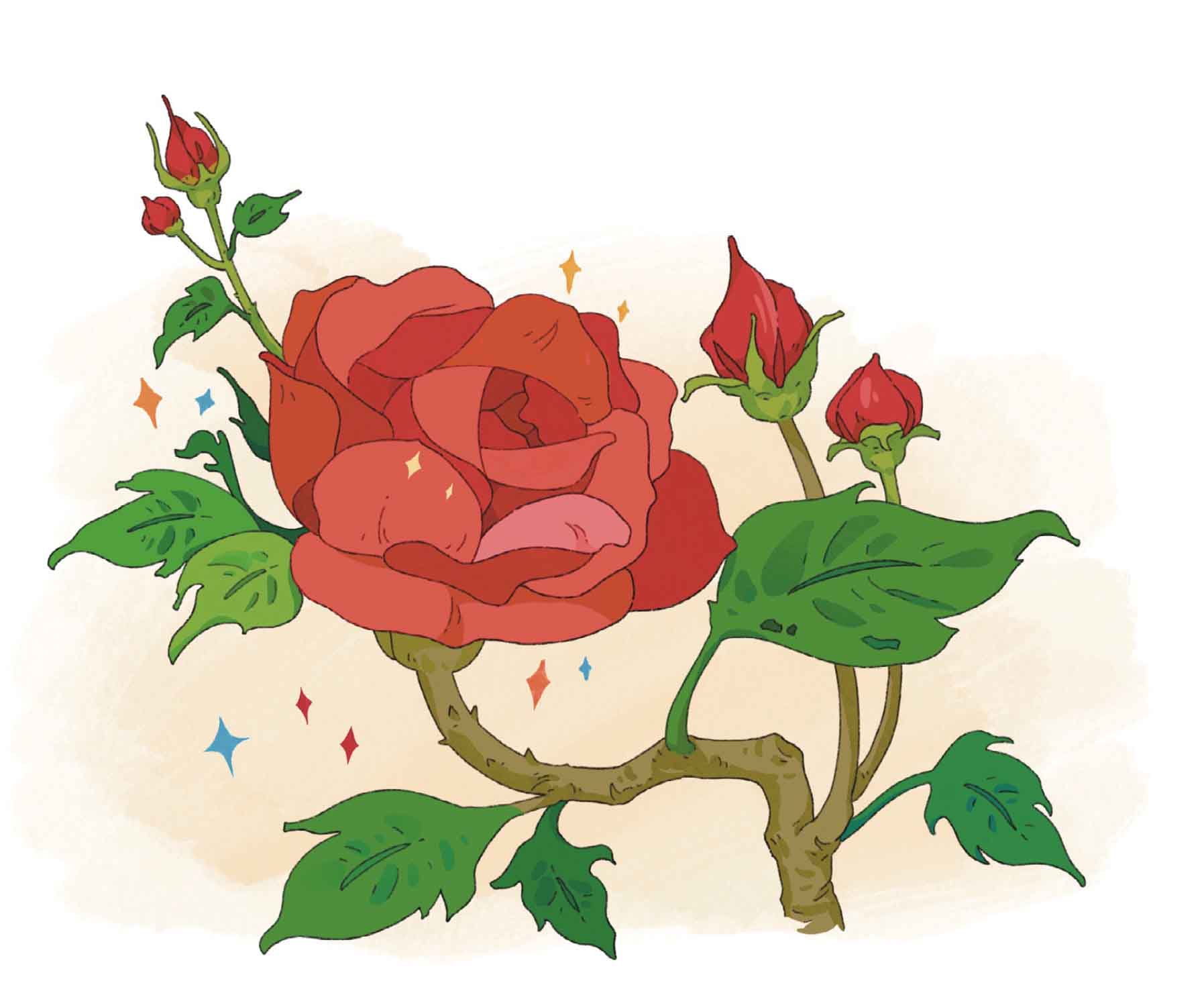 爸爸说:“它一定长在山坡上。”妈妈说:“蝴蝶还吻过它。”玫瑰花瓣儿听了,飘散着香味。